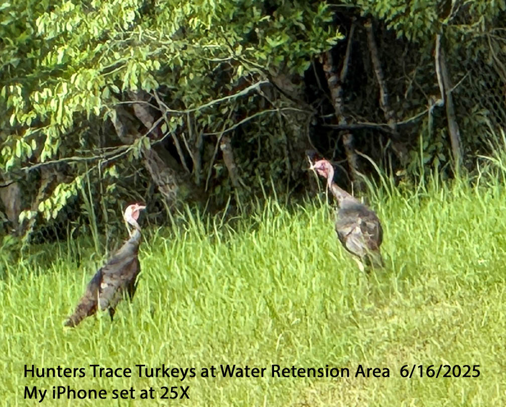 Recent Announcements - 2025 New HOA Officers: President: Trish Galinat, Secretary: Douglas Langlois, Vice President: Renae Sutley I need their phone #s, email addresses, and street addresses. We voted to reduce the HOA yearly cost from $120 to $60. My check for $120 was cashed. I also was told by someone that that would cover 2 years of HOA Dues. ***************************************************************************** We now have 2 fiber Optic cables in Hunters Trace: Both have much faster speed than cox. I called Cox and they currently have no plans for fiber cable here. I did ask about slow internet speed and they upped my speed for 2 years for free. 1. https://www.metronetfiberdeals.com/ Metronet: $30 to $70/month 2. Wire 3 | Fiber Optic Internet Provider Volusia & Brevard Counties Wire3 starts at $60/Month I would still like to hear from eople who switched to Fiber Cable and how they like it and what TV company they went with. Trish, our HOA president said that when they dug up her yard recently found out the diggers did not have a county permit to dig in Hunters Trace. She contacted the county about it. We should ask anyone digging in our yard to insure they have a county permit. I now have two upright wire boxes in my yard(Cox and Century Link) and three underground top panels: Water, MetroNet, and Wire3. The recent dig really messed up my yard grass and had about 100 rocks and small concrete pieces on top of my grass along with 5 plastic bottle caps. ******************************************************************************* 6/16/2025 Turkeys in the Hunters Trace NW water retension area: